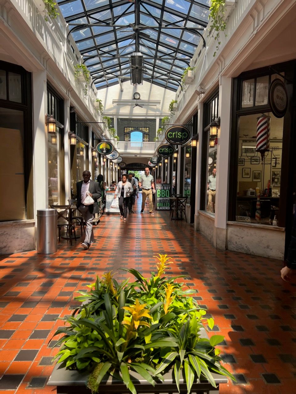 Listed on the National Register of Historic Places, Latta Arcade, and Brevard Court are some of Uptown Charlotte’s most significant early 20th-century commercial landmarks still in place. Built in 1914 and opened in 1915, the two-level art deco arcade features rows of retail shops, restaurants, and offices under a skylit roof that was originally designed to provide natural light for grading cotton. The historic property has been home to many businesses over the years, including a cotton brokerage firm, Edward Dilworth Latta’s development company Charlotte Consolidated Construction and the architecture office of William Peeps—the designer of the building.